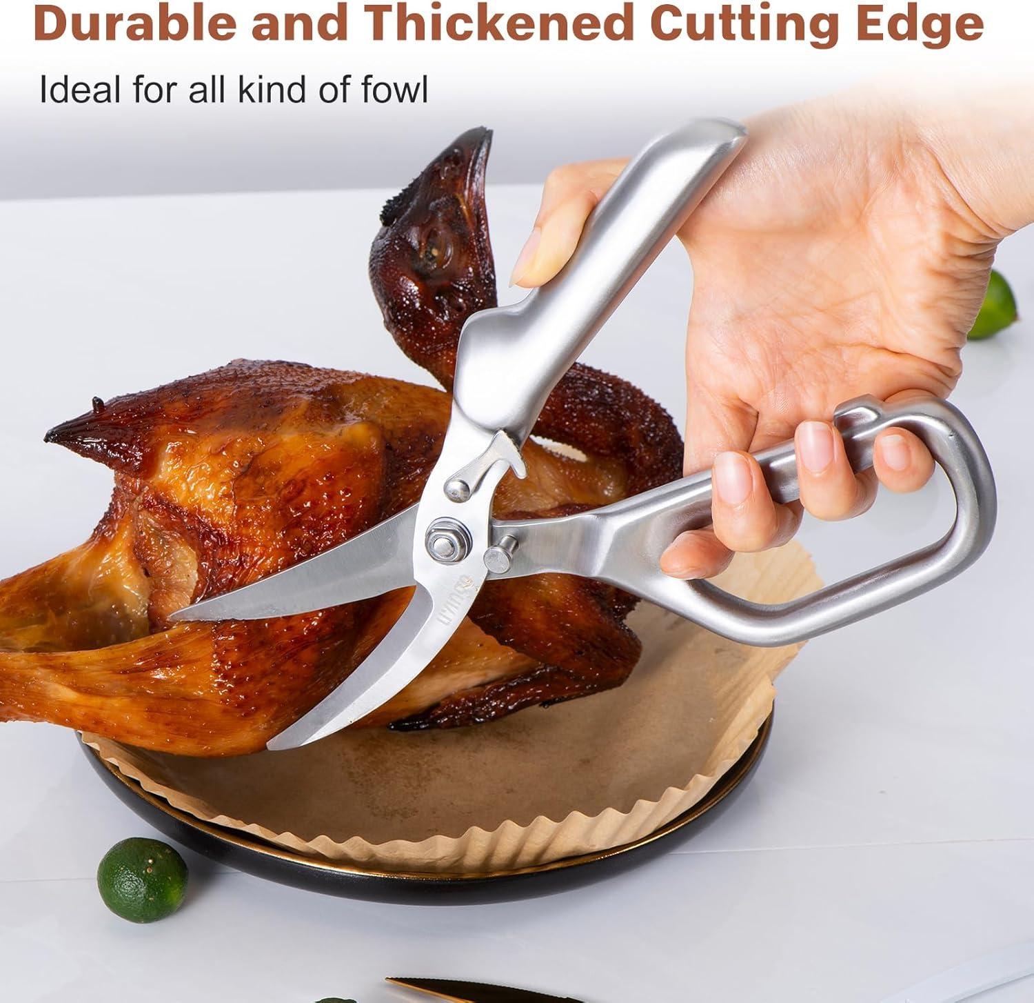MULTIPURPOSE: This stainless steel kitchen scissors can be used to cut everyday ingredients such as chicken, beef, chicken bones, vegetables, fish, shrimp and so on, safe and easy to use. Scissors are designed to be come apart and also easy to clean after use and can be used as a walnut holder and bottle opener. The ripples on the blade are designed to be used for scaling fish.